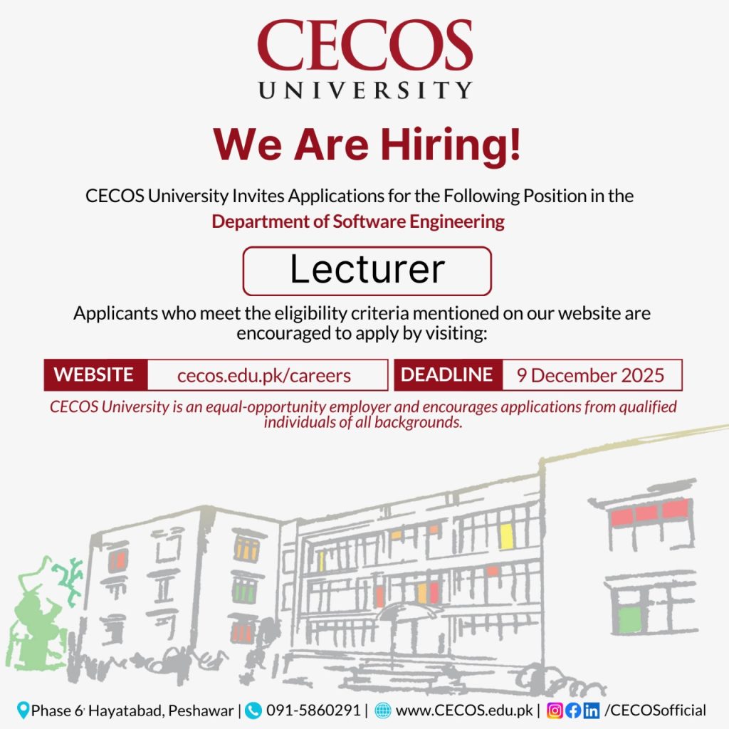 CECOS University invites applications from qualified & motivated individuals for the Junior Lecturer position in the Department of Software Engineering