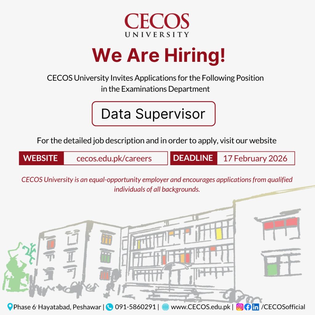 CECOS University invites applications for the position of Data Supervisor in the Examination Section.